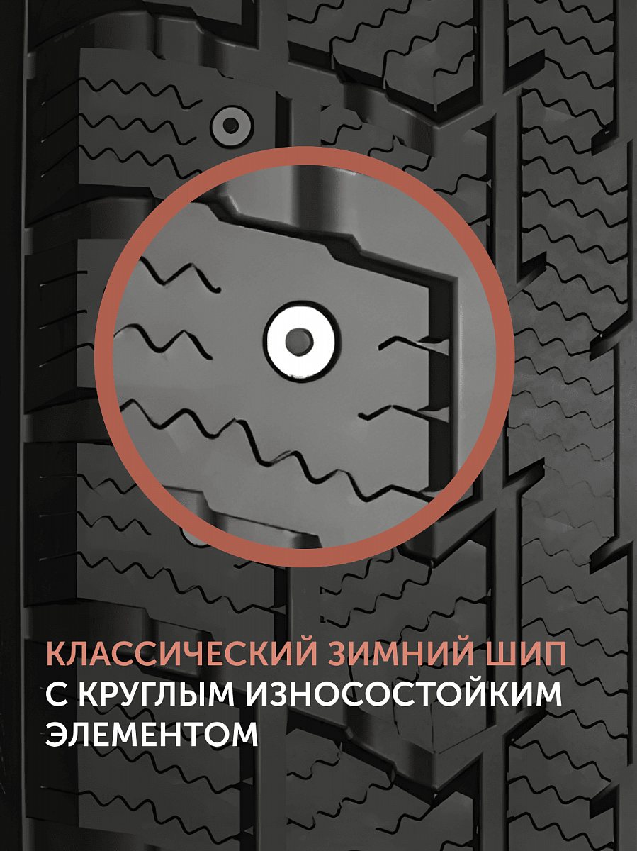 Асимметричный рисунок протектора и широкий разнос шипов снижают уровень шума при движении и способствует повышенной износостойкости.
